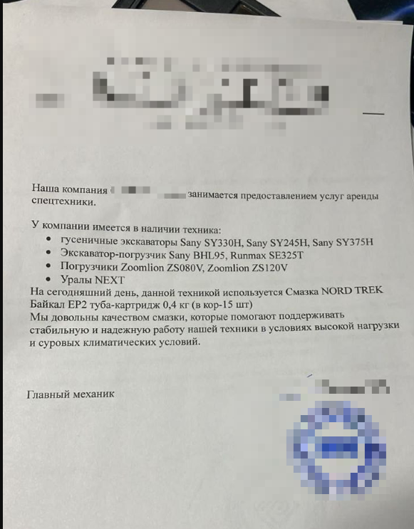 Результат: стабильная и надёжная работа техники в условиях высокой нагрузки и суровых климатических условий. Главный механик отметил качество смазки и рекомендует продукцию.
